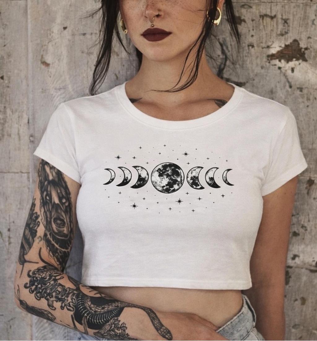 cropped feminino místico, cropped lua fases, cropped alternativo feminino, cropped algodão premium, cropped estiloso feminino, roupa mística feminina, cropped casual feminino